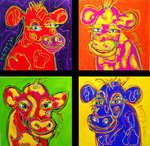 2006vierluik/acryl/linnen, 4 x 50 x 50 cm Dit vierluikje bestaat eigenlijk uit 8 schilderijtjes met olijke, grappige, verlegen, brutale and whatever koeienkoppen